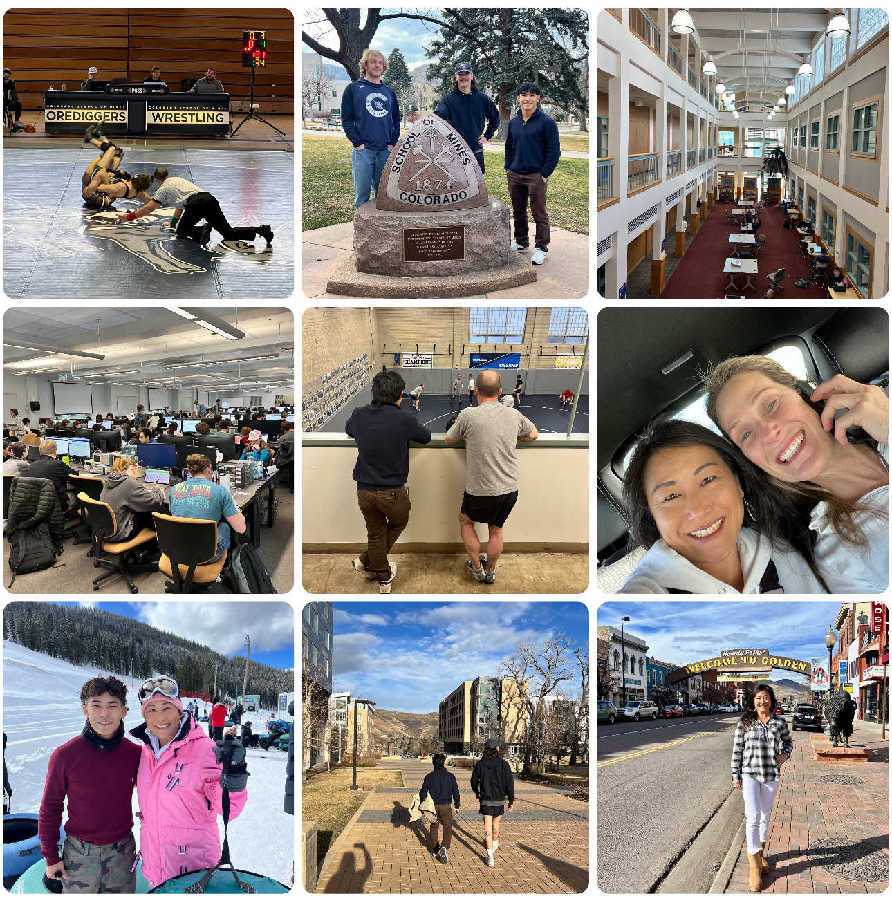 泰は高校生活の終わりに近づいており、どこの大学に進学するかを決める必要があります。彼は大学でレスリングをすることを希望していますが、現在の第一希望はメリーランド州アナポリスにある海軍学校です。軍事学校に入学するには、州上院議員または下院議員の推薦状を取得することから始まり、非常に複雑な申請手続きが必要です。泰は幸いにもクルーズ上院議員からの指名を獲得し、すべての書類を提出したが、返答は遅くとも4月までに届かない可能性があります。その間、レスリングの強豪大学も泰は視野に入れており、現在の第一候補はコロラド州ゴールデンにあるデンバー近郊の D2 学校であるコロラド スクール オブ マインズのようです。コーチたちは泰を招待ししたため、スーザンも先週末に二度目の訪問に同行しました。チームのレスラーのうち 2 人が私たちにキャンパスを案内し、練習の見学、その後ゴールデンのダウンタウンでコーチたちと夕食をとりました。翌日、私たちはマイン学校のレスリングチームのホームデュアルでの試合を観戦しました(彼らが勝ちました)。スーザンにとっては、幼馴染のキャサリンとも時間を過ごすことができ、とても楽しい旅行となりました。帰宅前に、全員がエコー マウンテンを訪れてチュービングを楽しみ、旅に終止符を打ちました。
