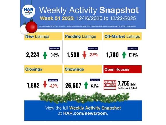 The week ending 12/22/25 data has been released! It’s Week #51 of 2025 and it shows that compared to Week #51 of 2024, there are slightly more new homes on the market (up 3.6%), slightly less homes going under contract (down 2.8%), less closings taking place (down 4.7%), and more showings taking place (up 6.1%). The most interesting number perhaps is the number of ‘off-market’ listings rising 17.3% compared to the same week last year. What does this mean? It means that 17% of seller tried to sell their home but 1. could not get the price they wanted or 2. could not get any offers or 3. the home could not pass inspections or 4. the seller and buyer could not agree on terms. So because of one of these reasons, the seller gave up and pulled the home off the market and gave up. This is an interesting phenomenon because in the past, the seller was either more accommodating or the buyer wanted the house so much that they would bid an acceptable price or give up on asking for repairs. This indicates that sellers are more strong willed than last year and buyers are simply not willing to pay prices they don’t feel are fair. Instead of the seller being flexible to the buyer’s demands, 17% of sellers simply give up and decide not to sell.